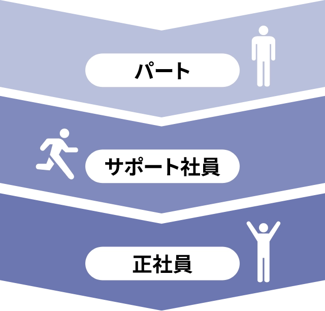 一定の基準をクリアすると、サポート社員、さらに正社員へとステップアップが可能です。